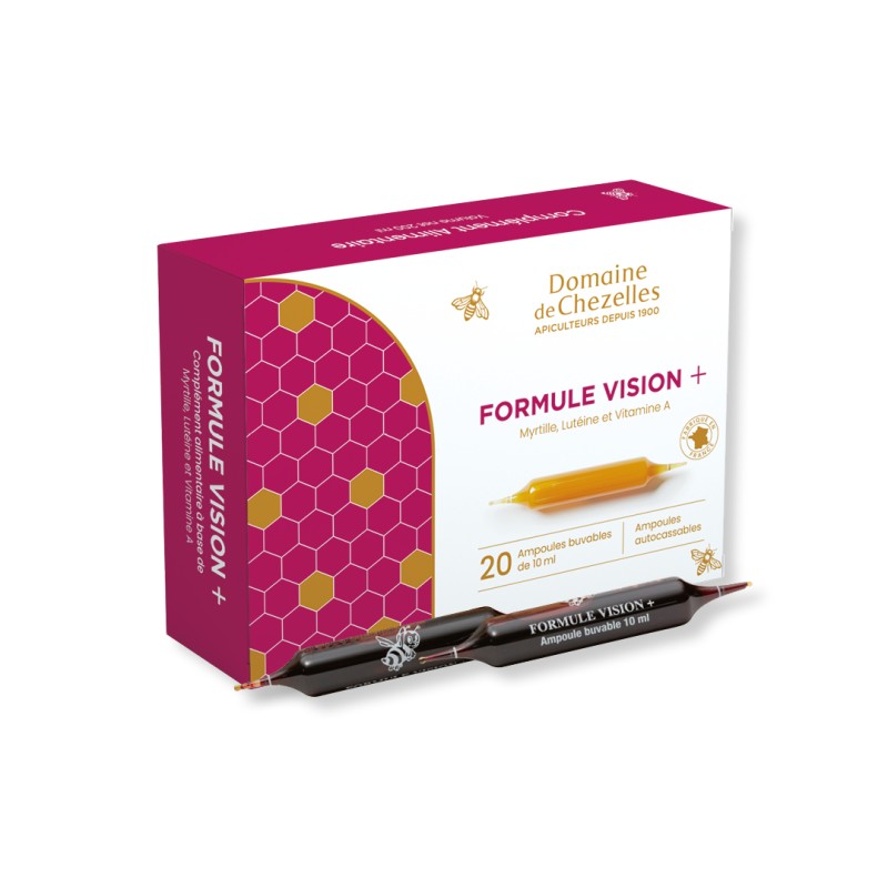 Ingrédients pour 2 ampoules de 10 ml : Eau purifiée QSP 20 ml, Miel multifloral 2000 mg, Jus concentré de baies de myrtille 908 mg, Complexe de bioflavonoïdes de citrus à 35 % d’hespéridine 200 mg (soit en hespéridine 70 mg), Arôme naturel de Fruits des Bois 200 mg, Extrait sec de baie de myrtille à 25 % d’anthocyanes 160 mg (soit en anthocyanes 40 mg), Esters de lutéine à 10 % 62 mg (soit en lutéine estérifiée 6,2 mg), Vitamine A acetate adsorbate (6,66 mg).