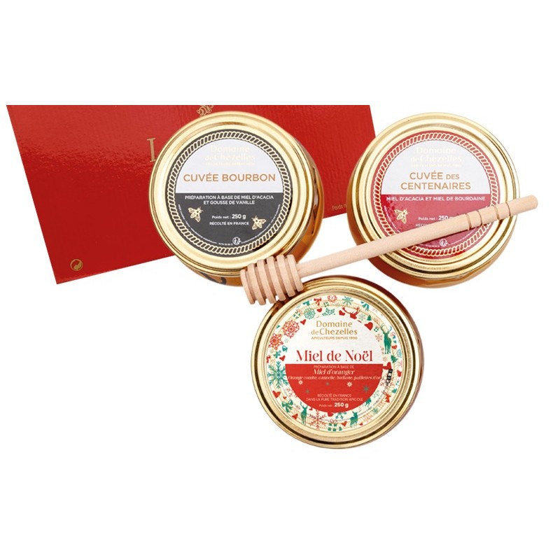 Ce coffret composé de notre fameuse cuvée bourbon (miel d’acacia agrémenté d’une gousse de vanille bourbon), de la Cuvée des Centenaires (association de miel d’acacia et de bourdaine) et de notre Miel de Noël. Le tout accompagné de l’authentique cuillère à miel en buis.