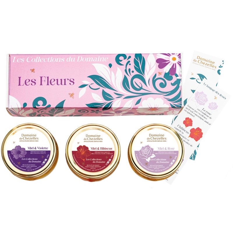 Trois subtils miels d’Acacia aux arômes de Rose, d’Hibiscus et de Violette. Délicats et délicieux à vous faire pâlir de plaisir ! Le raffinement suprême pour une idée cadeau.
