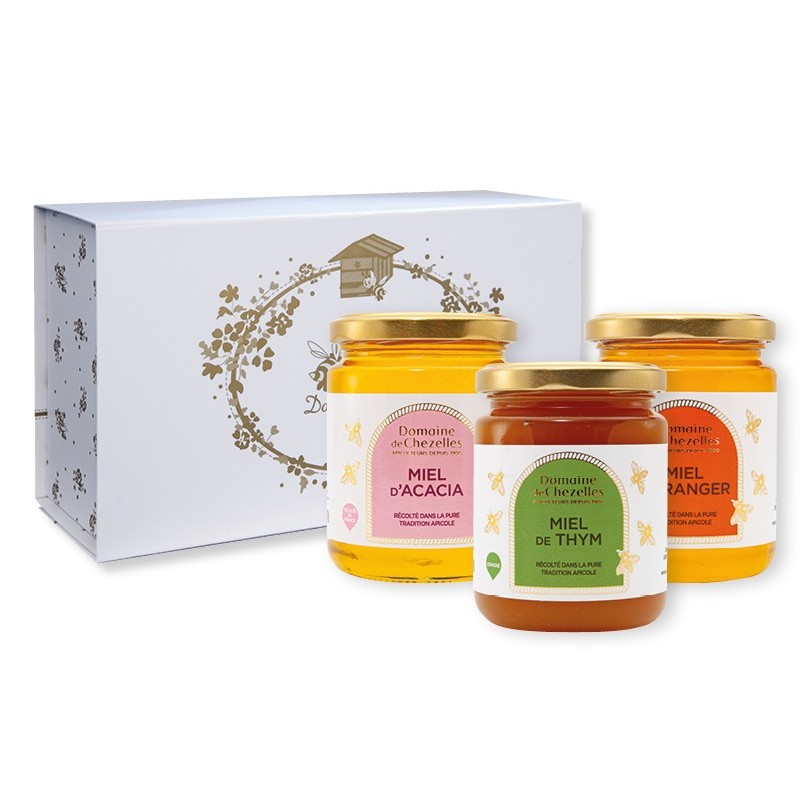 La douceur de l’Acacia, la puissance du Thym et la délicatesse de l’Oranger sont réunis dans ce magnifique coffret de 3 Miels réputés qui fera le bonheur des gourmands et des amateurs de saveurs subtiles.